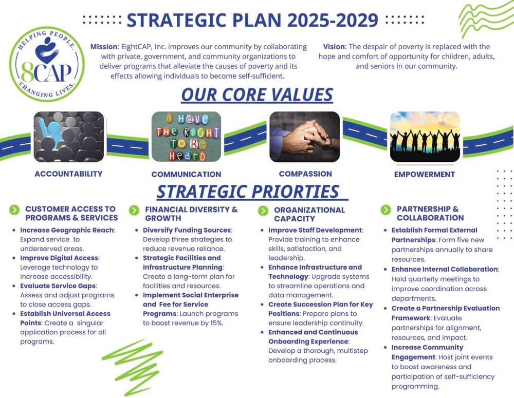 EightCAP, Inc. improves our community by collaborating with private, government, and community organizations to deliver programs that alleviate the causes of poverty and its effects allowing individuals to become self-sufficient.